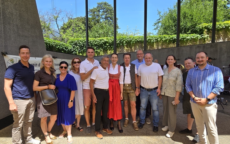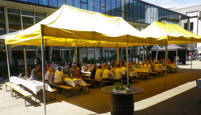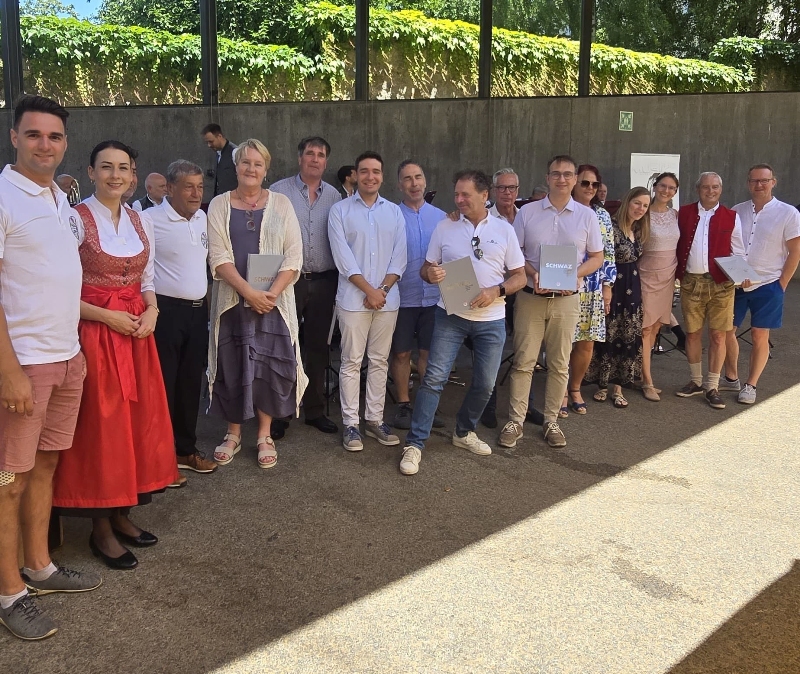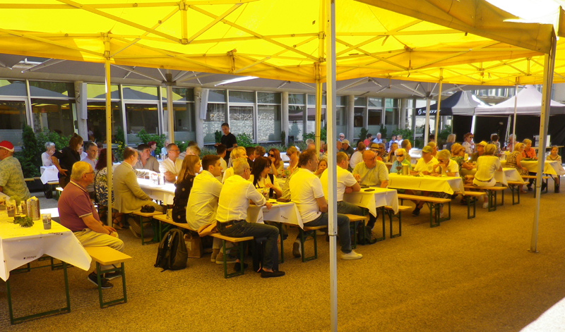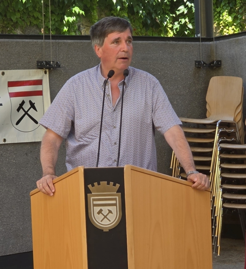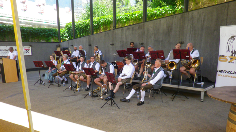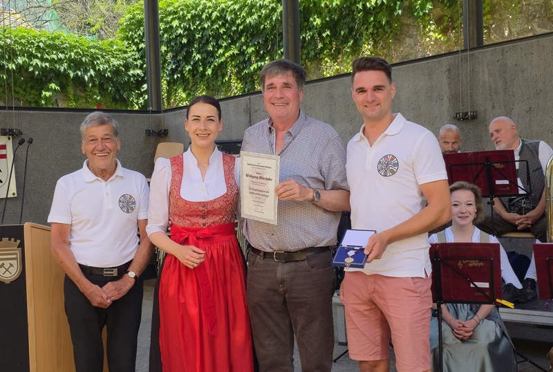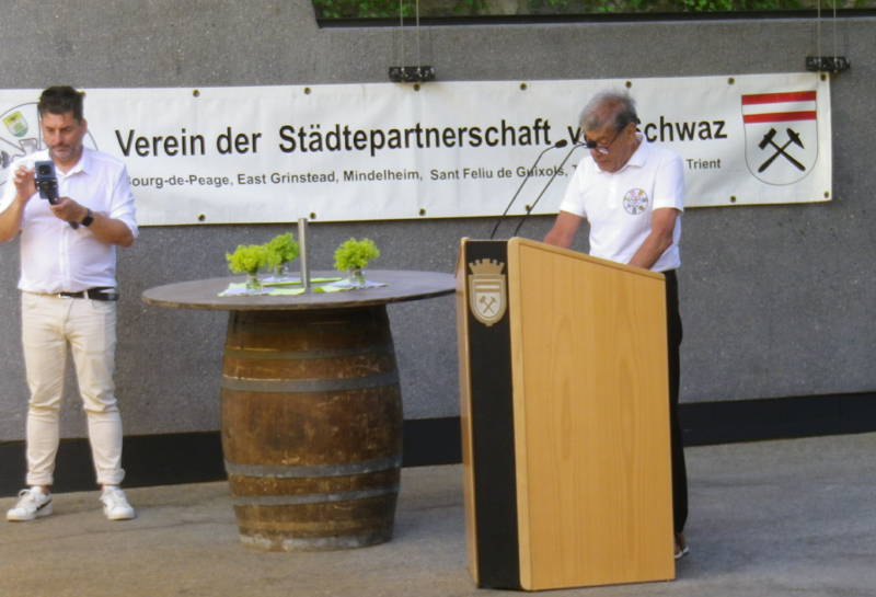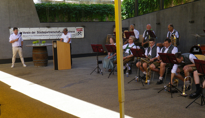 Dabei wurden natürlich einige Ansprachen gehalten. Aber auch die Unterhaltung kam nicht zu kurz. Nach dem Frühschoppen der Schwazer Stadtmusik gab es am Nachmittag Musik von Franz Posch und seinen "Innbrügglern". Von unseren Partnerstädten waren Delegationen gekommen, aus Mindelheim, Sant Feliu, Tramin, Trient und Verbania. Bourg de Péage und East Grinstead konnten leider aus Termingründen nicht dabei sein. Ein besonderer Moment war dann natürlich die Verleihung des Schwazer Ehrenzeichens an den Bürgermeister von Tramin, Wolfgang Oberhofer.