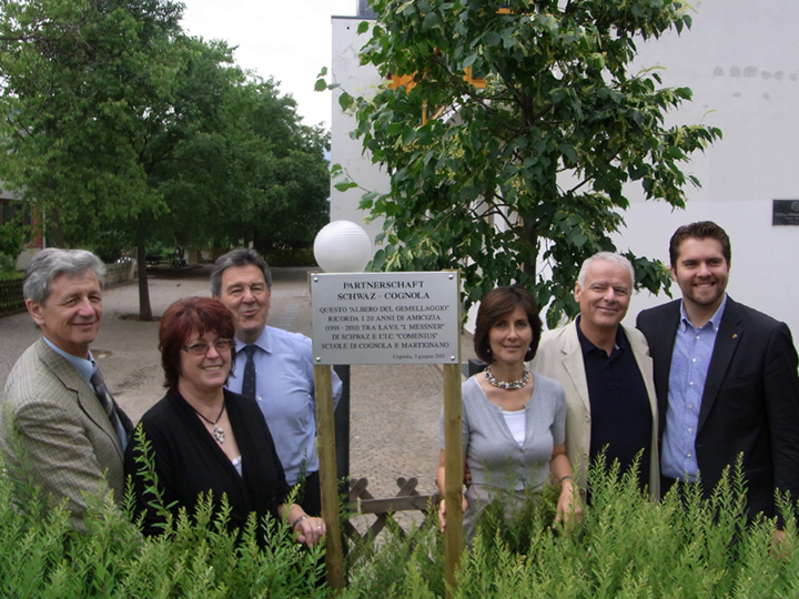 Cognola, 3.6.2011 Der 3. Juni 2011 war im Kalender der Johannes-Messner-Schule und der Scuola Eugenio Bernardi schon seit langem dick rot angestrichen. Die 3 vierten Klassen der Messner-Schule machten sich diesmal zum 20-jährigen Jubiläum der Schulpartnerschaft mit einer verstärkten Delegation auf den Weg nach Cognola, im Trentiner Stadtteil Argentario. Natürlich gab es wieder wie gewohnt ein gemeinsames Programm in den Klassen. Die gegenseitigen Besuche sind ja der krönende Abschluss der Partnerschaft, die sich über alle Schuljahre erstreckt. Da können sich die Schülerinnen und Schüler, die schon längst in Kontakt stehen, endlich auch persönlich kennen lernen und dabei ihre Sprachkenntnisse nützen. Aber diesmal gab es auch etwas zu feiern. Die erfolgreiche Schulpartnerschaft besteht nunmehr seit 20 Jahren. Und zur Erinnerung an dieses Jubiläum wurde vor der Schule in Cognola ein Lindenbaum gepflanzt. Bei der Enthüllung der Erinnerungstafel mit dabei: Der Präsident des Gemeinderates von Trient, Renato Pegoretti, der Vorsitzende des Stadtteilrates Dr. Armando Stefani, der Obmann des Partnerschaftsvereines Egidio dalla Costa, der Vertreter der Stadtgemeinde Schwaz, Philipp Binder, die Direktorinnen Kristina Psenner und Maria Silvia Bocardi, die Lehrerschaft der beiden Schulen und Frau Mag. Badieh Poostchi, die die Partnerschaft seit dem Beginn 1991 begleitet. Spontan wurde von den Schwazer Lehrpersonen die Linde besungen. Das vierstimmige „Am Brunnen vor dem Tore“ erhielt von den Ehrengästen gebührenden Applaus. Philipp Binder, der als ehemaliger Schüler der Messner-Schule bereits vor 17 Jahren an diesem Projekt teilgenommen hat, war sichtlich bewegt und ermunterte die Schulkinder, diese Partnerschaft zum besseren Kennenlernen unserer europäischen Nachbarn in Trient und ihrer Kultur und Sprache so gut wie möglich zu nutzen. OAR Hans Sternad,